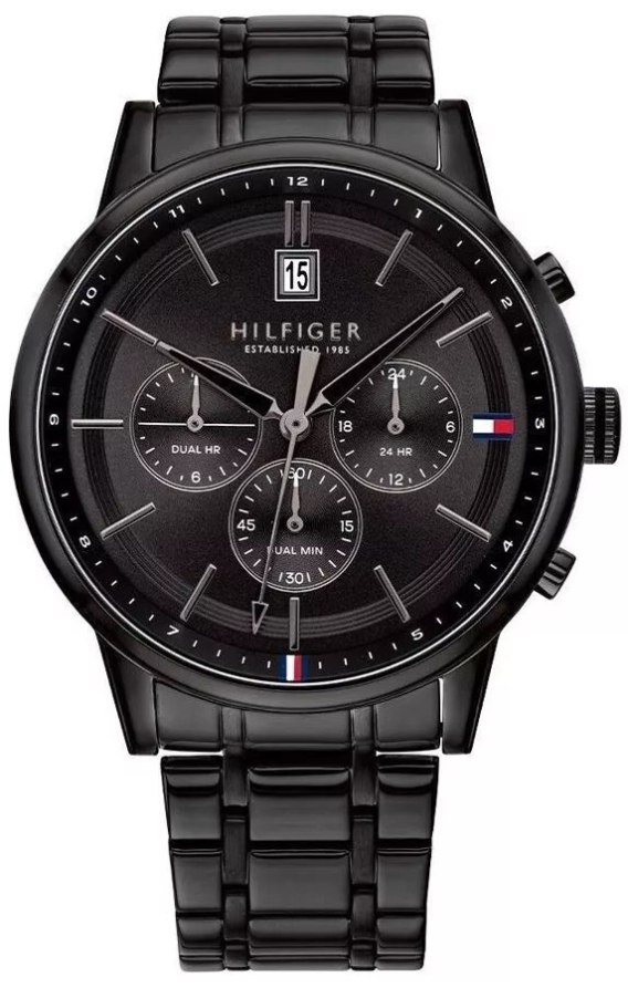 Głęboka czerń koperty, tarczy i bransolety tworzy spójną, wyrazistą bazę, podkreśloną precyzyjnymi srebrnymi indeksami i wskazówkami, które nadają całości wyjątkowego charakteru. Delikatny akcent w postaci logo Tommy Hilfiger na godzinie 3 dodaje subtelnej klasy, a kontrast srebrnych detali z czarną konstrukcją mówi jedno - to zegarek dla mężczyzny, który ceni styl i ponadczasową elegancję. Wyrazistości i charakteru dodaje bransoleta, misternie zaprojektowana z ogniw o różnej szerokości - wąskich i szerszych - tworząc dynamiczny, męski design, który podkreśla unikalny styl zegarka.